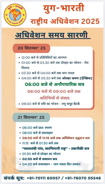 संक्षिप्त रूपरेखा :- इस दो दिवसीय अधिवेशन में प्रेरणादायक बौद्धिक सत्र, स्वावलम्बन के पुरोधा द्वारा अपने प्रयोगों पर उपयोगी चर्चा , युगभारती की गतिविधियों की समीक्षा, आगामी योजनाएं, सांस्कृतिक प्रस्तुतियाँ, तथा ओरछा के ऐतिहासिक स्थलों का अवलोकन आदि समाहित होंगे।